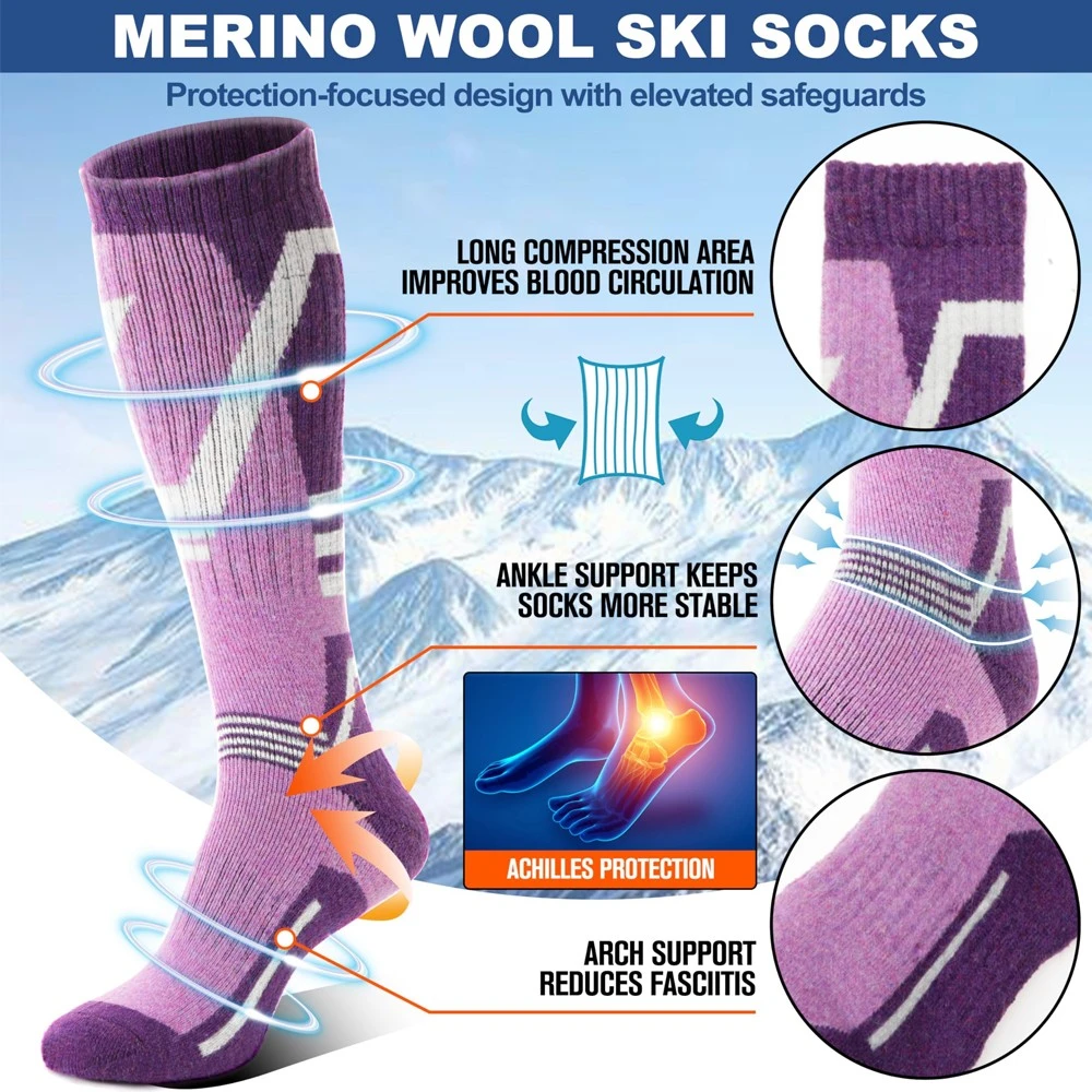 These ski socks feature thick padding in high-impact areas such as the shin, heel, and toes to absorb shock and impact, reducing fatigue and the risk of injury.
